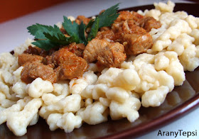 A pörköltöt a nokedli fészken, melegen kínáljuk.